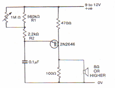 This traditional metronome circuit is powered by voltages from 9 to 12 V and output drives a common speaker.
