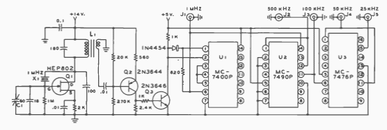 We found this circuit in a 1977 radio documentation. The circuit uses TTL frequency dividers from the time.