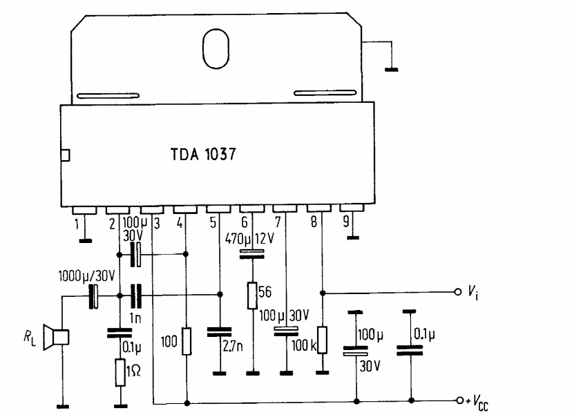 Obtained from the 1976 Siemens integrated circuits manual, this audio amplifier has thermal shutdown. The power supply is 12 V, as the indicated use is in the car.