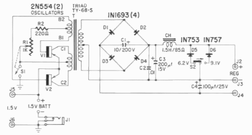 This power supply, which is a small inverter, runs on a single large 1.5V battery providing 6V and 9V outputs. The circuit is from a 1960s Gernsback documentation.
