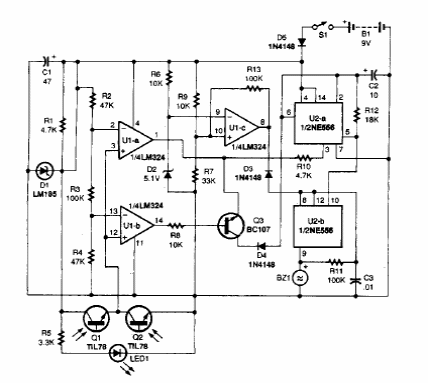 This circuit was found in a Popular Electronics from the 1990s. The circuit indicates the level of an object, detecting any tilt by an optical system.