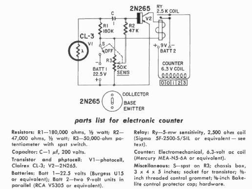 This photoelectric circuit from a 1960 publication uses a 6.3 V electromechanical counter, common at the time.