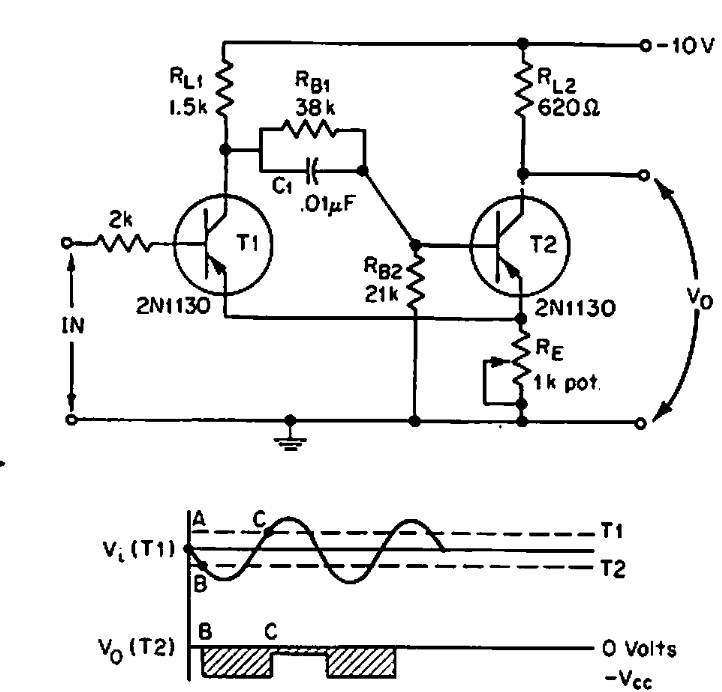 This basic Schmitt trigger was found in an American publication from 1968. The circuit uses transistors from the time. Modern general-purpose types can be used.