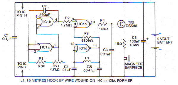 This is one of many metal detector versions of this type found on this site. This one uses a small headphone and an explorer coil.
