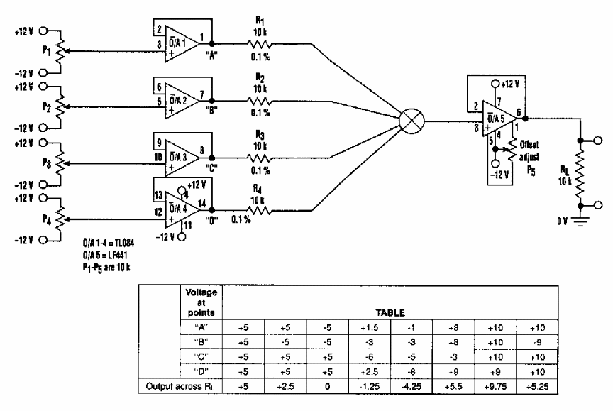 This circuit was found in an American documentation from the 90's. What it does is provide at the output a voltage that is the average of the voltages set for the inputs.