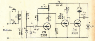 Obtained from a 1967 documentation, this circuit uses transistors from the time. The galvanometer can be a microammeter or a milliammeter from 0 to 1 mA.