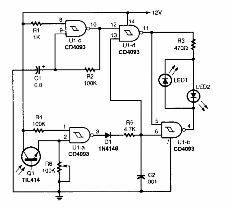 This crossover signal for model railways was found in a Popular Electronics from the 90's. The circuit triggers with the passage of the locomotive in front of the sensor. Any phototransistor can be used as a sensor.