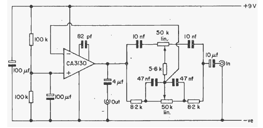 This circuit was obtained from a 1977 documentation. The circuit does not require a symmetrical power supply. Potentiometers can be 47k.