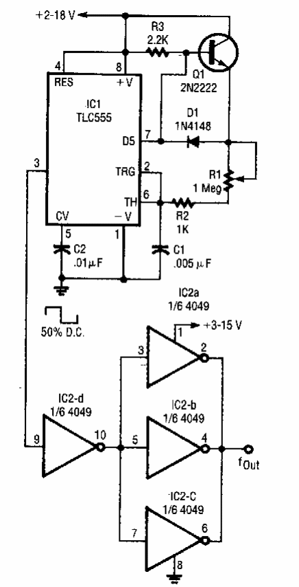 Found in an Electronics Now from the 90s, this circuit with the 555 generates a signal with 50% duty cycle. Frequency is set in R1.