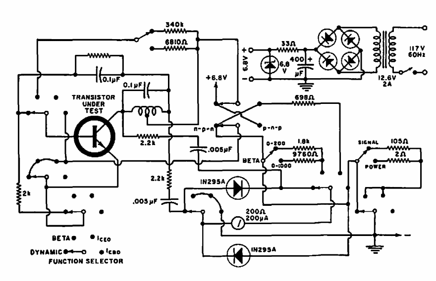We found this circuit in a 1967 Electronics World. It analyzes a transistor by determining its type.