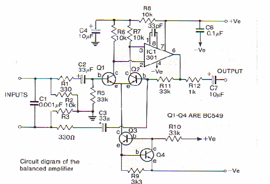 The circuit shown has a differential input and employs transistors of an array of matched types. The circuit requires a symmetrical source and has been found in a foreign component manual.