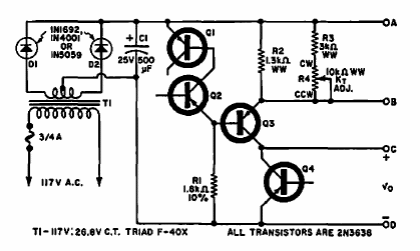 This voltage reference was found in a 1967 Electronics World. The transistors are from the time, some of them being purposely wired with one of the disconnected terminals.
