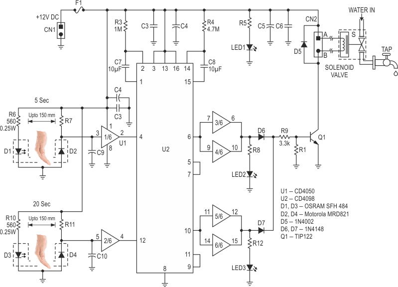 This dual control was based on Texas Instruments documentation for the CD4050. The circuit has two optical sensors to turn the tap on and off or time it out in 20 seconds. The circuit was developed around the Covid 19 Pandemic and uses common components.
