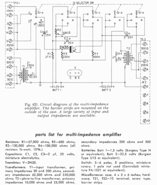 This interesting amplifier circuit with selectable impedance is from a 1960s book of Gernsback transistors. The transistor is from the period. The circuit can be adapted to operate with modern transistors.