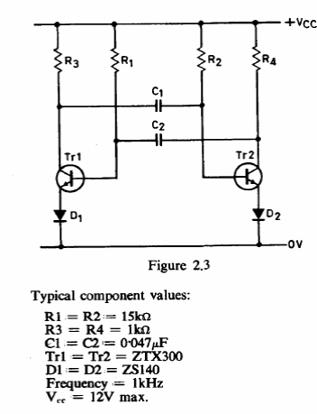 Found in a 1974 Ferranti manual, this circuit uses diodes to limit the voltage on the transistors. The frequency is approximately 1 kHz.