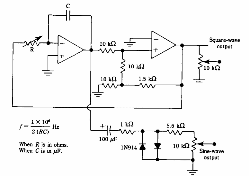 We found this circuit in an old documentation. The operational can be of any type and the frequency is given by the formula next to the diagram.