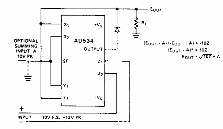 Found in Analog Devices documentation from the 1980s, this circuit provides an output voltage that is the square root of the input voltage.