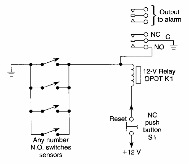 This latching alarm circuit using relays was found in American documentation. Sensors are connected in parallel.