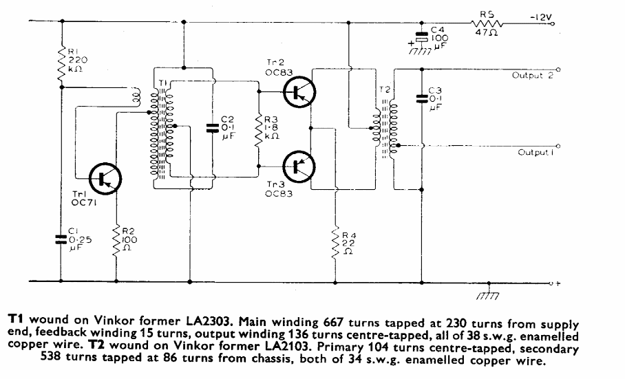 This circuit for equipment adjustment and diagnostics was found in a Mullard transistors manual from 1960. Information about the transformers is given with the diagram.