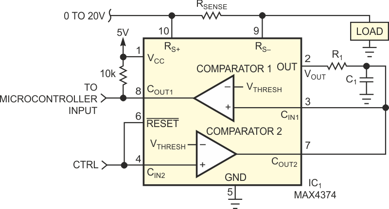 This circuit was based on Maxim's MAX4374. The circuit senses the current in a 0 to 20 V line and has a timed output signal, with time given by R1 and C1. Power is supplied with 5V.