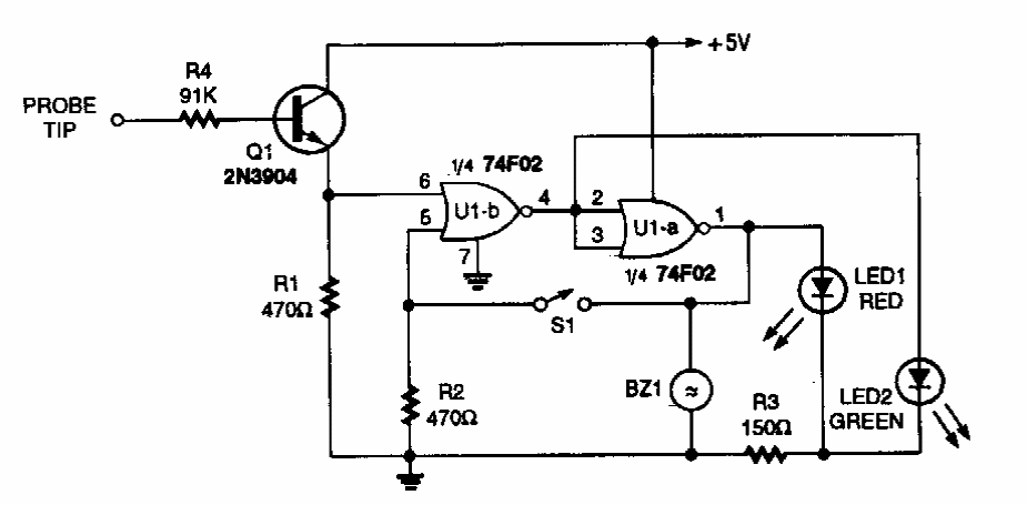 This logic probe was found in a Popular Electronics from the 90s. The circuit is TTL and must be powered with 5V.