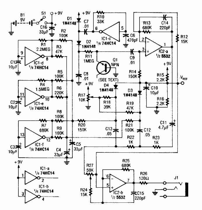 Published in Electronics Now from the 90s, this circuit called Surf Man produces a sound effect in the headphones. It is up to the reader to verify what type of sound is this, which according to the article is a modulated white noise simulating sea waves.