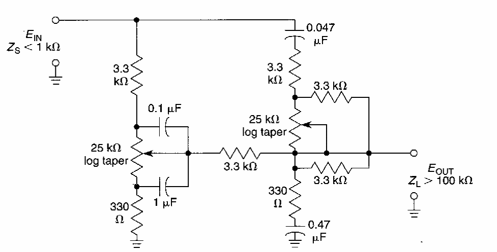 This passive circuit can be used in input steps of amplifiers and other audio equipment. The circuit is passive introducing losses that must be compensated.