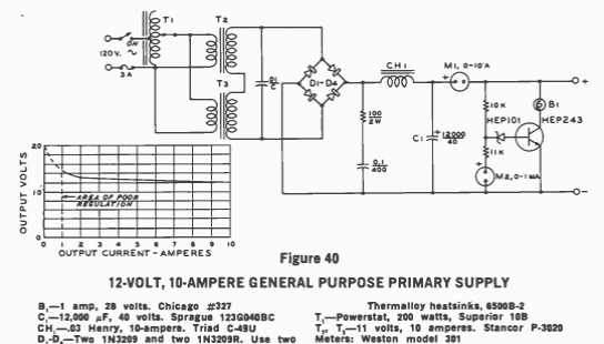 This power supply is from a 1977 documentation. The transformers have 11 V secondary with 10 A.