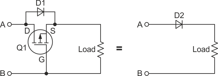 This circuit provides reverse power polarity protection using a power MOSFET and a diode. The MOSFET must be current in accordance with the current of the protected circuit.