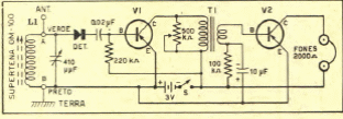 This circuit is from a June 1968 Supertena Bulletin of Popular Electronics. The transistors can be general purpose and the earphone is high impedance magnetic.