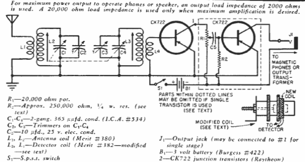 This MW receiver was found in a Raytheon circuit manual from the 1960s. Transistors are the first commercial types available. Output is via headphones.