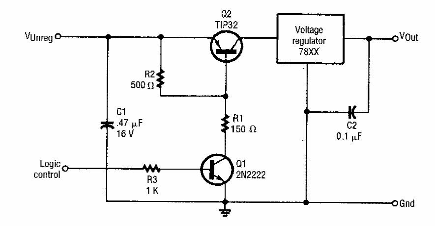 This regulator can be controlled by a logic signal. The circuit is from an Electronics Now from the 90s. Note that the switching transistor is before the integrated circuit.