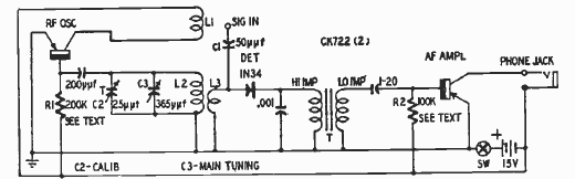 This circuit was found in a book on transistors from 1954. It works by the beat that is detected by the earphone. When the measured frequency equals the generated frequency, the earphone beat is zero. Thus, C3 is calibrated for a frequency scale, according to coils L2 and L3.