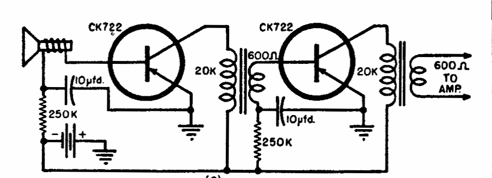 Like the previous circuits, this one uses a small speaker as a microphone and has two amplification stages with 600-ohm output.