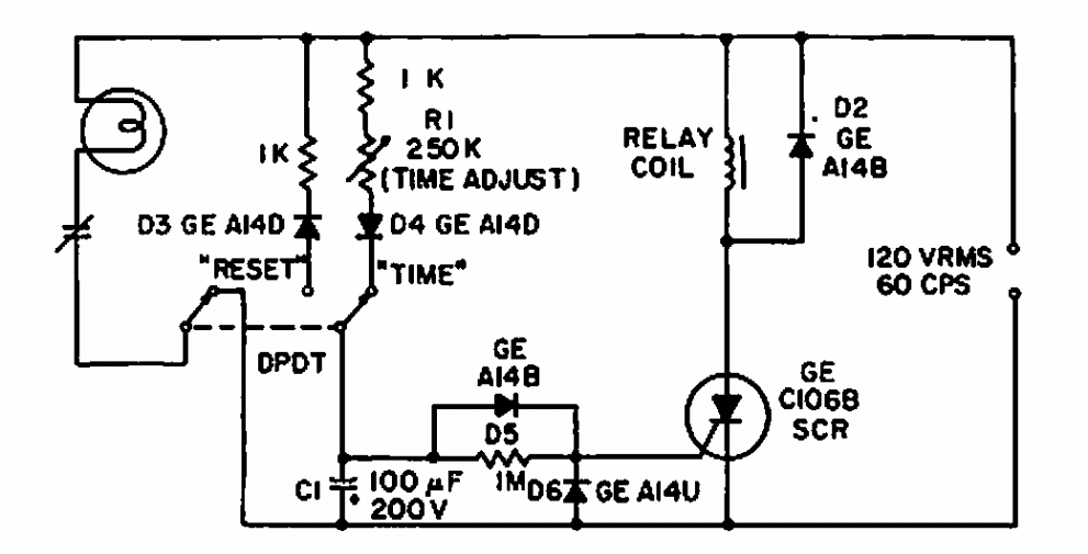 Found in General Electric and 1967 documentation, this circuit automatically turns off the lighting in a garage after the time set in R1.
