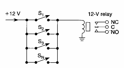 We found this circuit in an American brochure from the 90s. In it we have the way to implement a 4-input OR gate with switches and a relay.