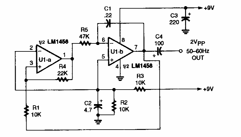 This circuit was found in an old Popular Electronics. The integrated circuit is equivalent to a double 741. The source does not have to be symmetrical.