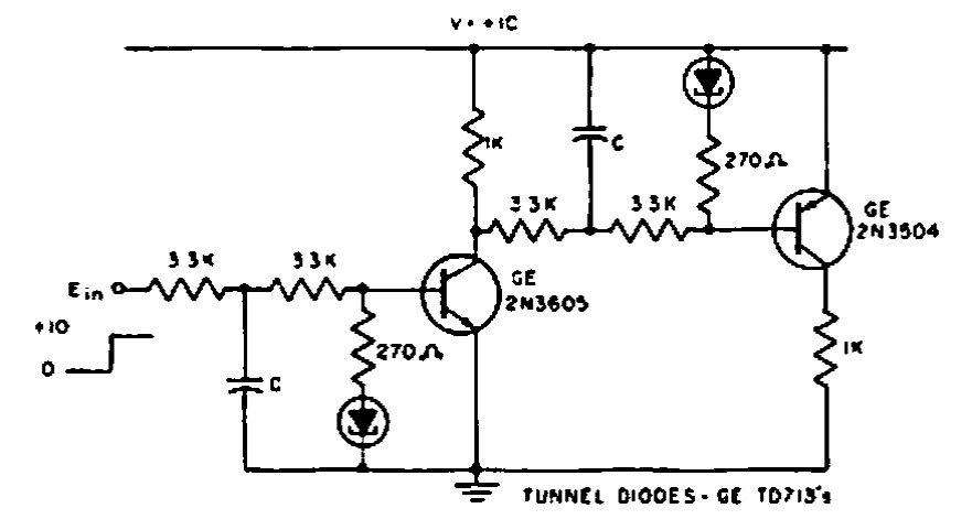 With two cascading tunnel diodes, this circuit found in a 196 General Electric documentation provides capacitor-dependent delays.