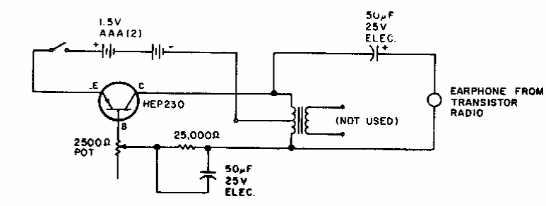 This circuit was found in an old American publication. The transformer is the type of output found in old transistor radios. The transducer is crystal headphone.