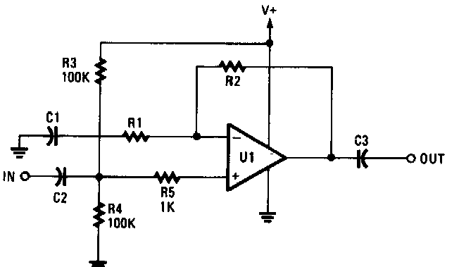 This non-inverter circuit was found in a Radio Electronics. It shows the basic configuration of a single power source operational amplifier.