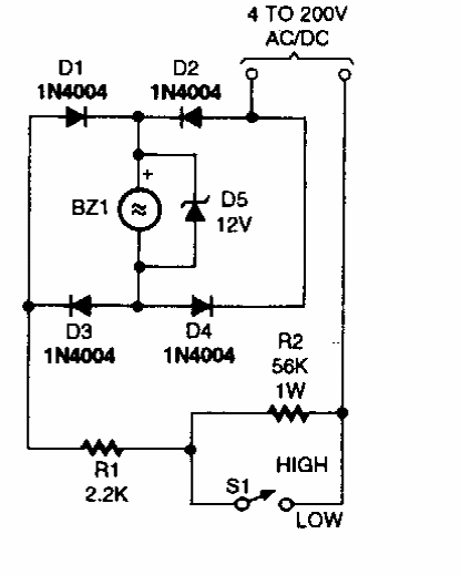 Suggested by a Popular Electronics from the 90s, this circuit uses a buzzer to indicate the presence of voltages in the range of 4 to 220V AC and DC.