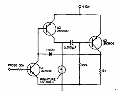 In this version from the 60s, the indicator is a light bulb, but the circuit can be modernized with the use of LEDs and equivalent transistors.