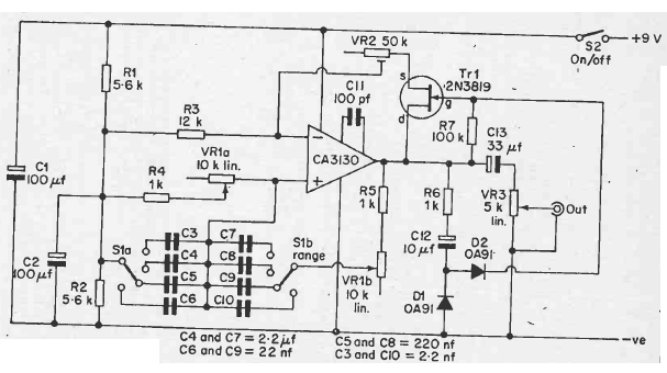 This interesting op-amp signal generator circuit was found in a 1977 documentation. The circuit has an automatic gain control generating signals from a few hertz to several tens of kilohertz.