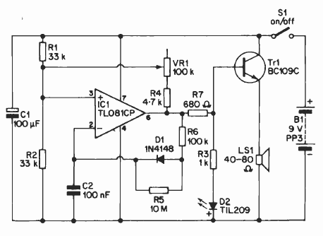 We found this circuit in an English publication. The transistor can be BC549, and the power supply can be between 5 and 9 V.