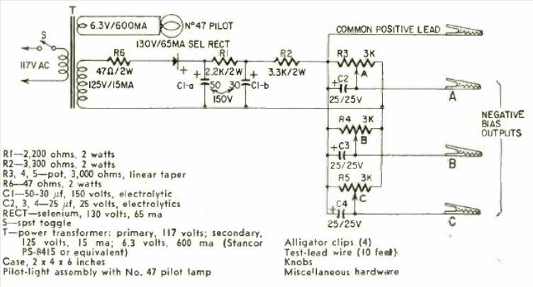 This circuit was found in the May 1959 Radio Electronics magazine. Its purpose is to provide bias voltages for circuits under test. The circuit is isolated from the power grid.