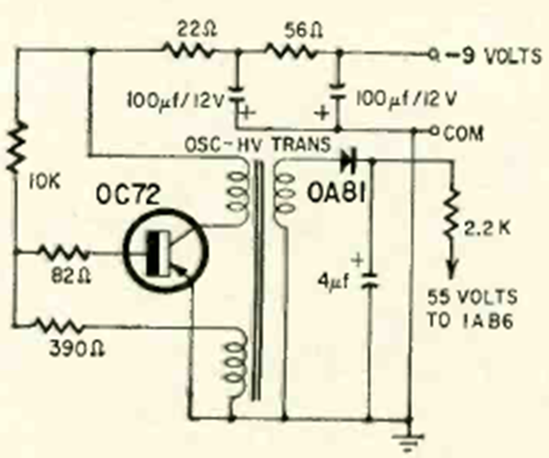 This voltage inverter circuit is from a Radio Eklectronics from October 1965. It was used in hybrid radios at the time. The transformer determines the output voltage.