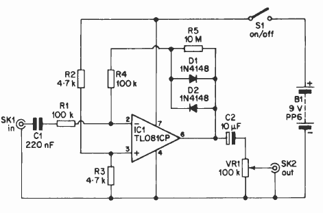This simple guitar distortion effect was found in a documentation from the 90's. The circuit is current and equivalent operational amplifiers can be used.