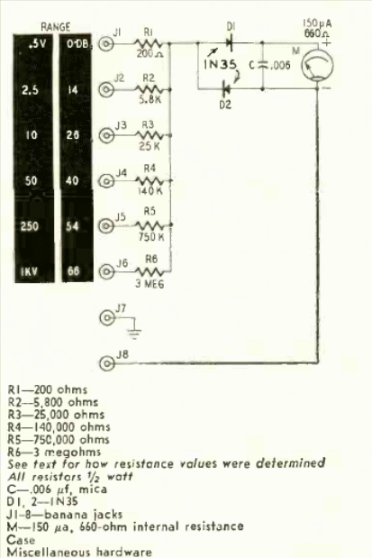 This simple voltmeter takes advantage of a 150 uA instrument. The circuit is from a Radio Electronics from April 1958. Other instruments can be used to recalculate the resistors of the input resistive network.