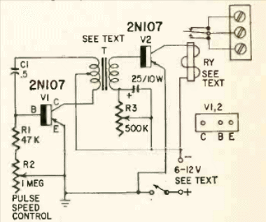 This circuit activates a relay producing pulses at regular intervals adjusted by the potentiometer. The circuit was published in Radio Electronics magazine in January 1959.