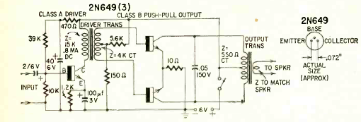 This circuit is from a Radio Electronics documentation from July 1959. In this documentation the new transistor was announced. The circuit power was 100 mW with 18 V supply.